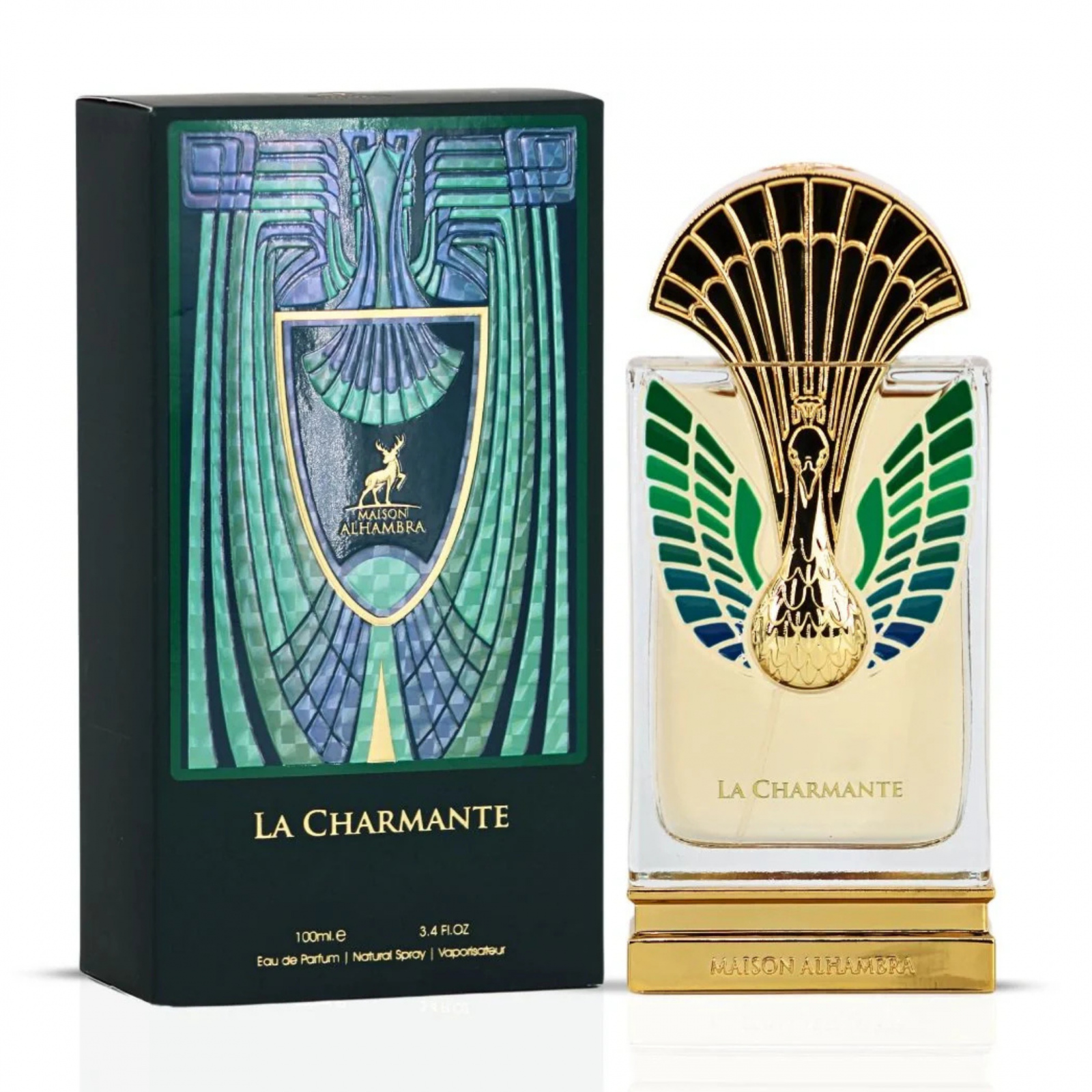 La Charmante de Maison Alhambra este un parfum Floral Fructat Gurmand unisex. Acesta este un parfum nou La Charmante a fost lansat in 2025. Notele de varf sunt piper roz, bergamot si mandarina; notele de mijloc sunt bujor, floare de portocal si lacramioare; Notele de baza sunt lemn de santal, vanilie, mosc, ambroxan si paciuli.